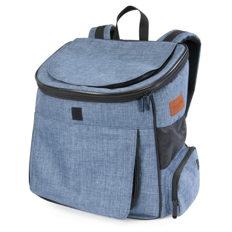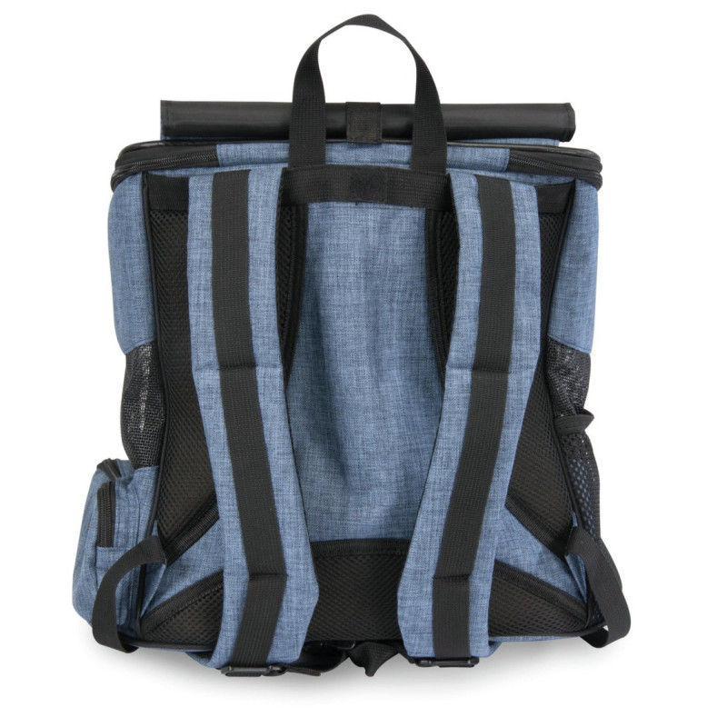 Praktický modrý ruksak na prepravu zvierat.