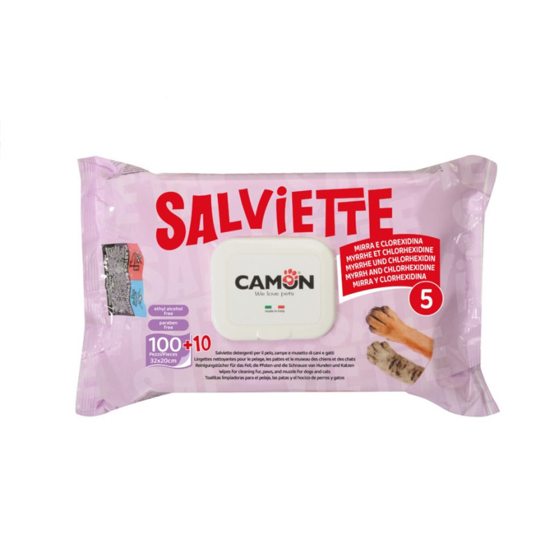 Čistiace obrúsky na čistenie srsti a tváre s chlórhexidínom a vôňou myrhy. Veľmi praktické čistiace obrúsky pre vášho domáceho maznáčika, majte ich po ruke doma aj na cestách na čistenie srsti a labiek, odstránenie zápachu a čistenie tváre a uší. Ich jemné zloženie osviežuje, vyživuje a chráni srsť. Dostupné v novom 110-dielnom balení.
