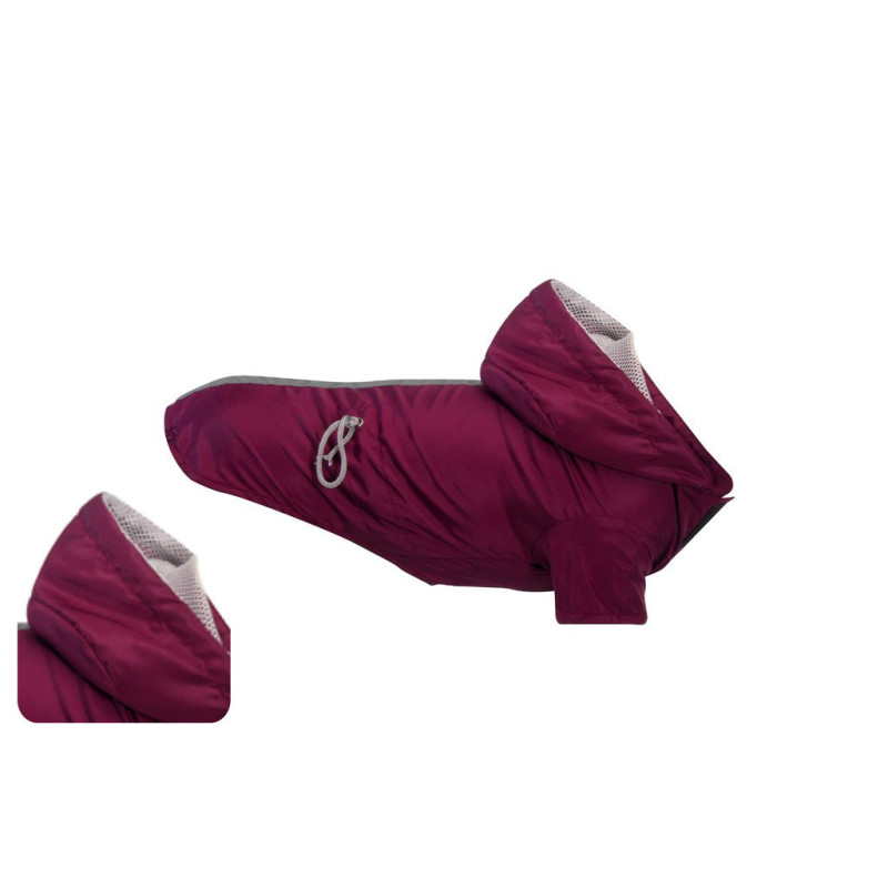 Nepremokavý pršiplášť s kapucňou a rukávmi, podšívkou zo sieťoviny. Sťahovacia šnúrka na chrbte pre nastaviteľné strihanie, kontrastný stredový pás. Otvor na krk a elastické kliny na zadných nohaviciach.