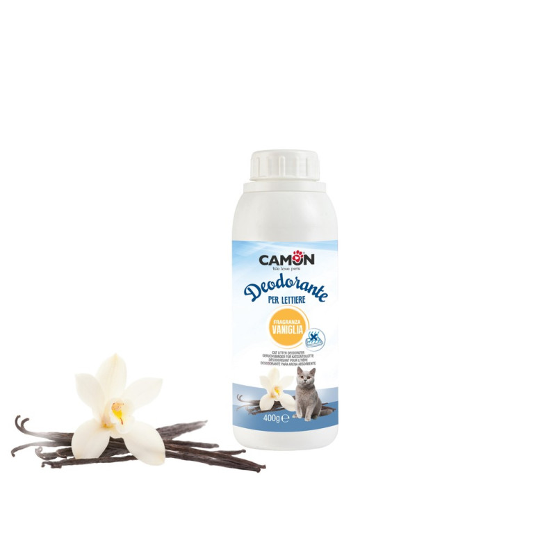 Deodorant do podstielky Camon s vôňou vanilky vhodný do podstielky pre mačky, vtáky a iné malé zvieratá. Neutralizuje zápach v záchodíku.